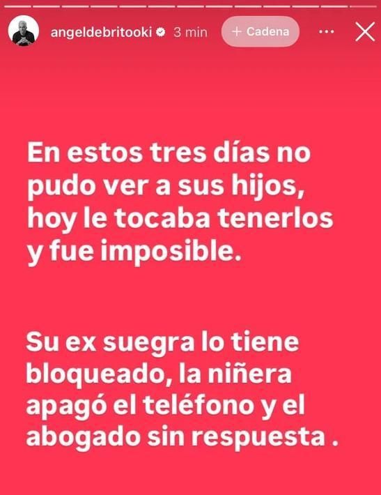 Así lo informó el conductor de LAM en sus historias de Instagram: "En estos tres días no pudo ver a sus hijos, hoy le tocaba tenerlos y fue imposible. Su ex suegra lo tiene bloqueado, la niñera apagó el teléfono y el abogado sin respuesta".