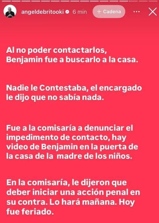 "Al no poder contactarlos, Benjamín fue a buscarlo a la casa. Nadie le contestaba, el encargado le dijo que no sabía nada. Fue a la comisaria a denunciar el impedimento de contacto, hay video de Benjamín en la puerta de la casa de la madre de los niños", reveló.