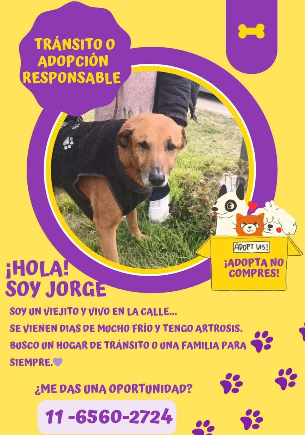 Todo aquel que quiera hacerse cargo con responsabilidad y sobre todo mucho amor de Jorge, debe comunicarse al 1165602724. "Todos vivimos corriendo, pero es importante pararse unos segundos, mirar lo que sucede, no ser indiferente que, es tan común hoy en día porque la realidad es que existen un montón de Jorges", aseguró Elena que tiene un profundo cariño hacia el viejito que la espera todos los días para recibir esas caricias que tanto merece.