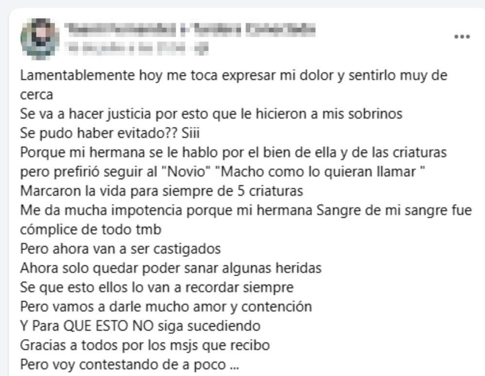 En la publicación, además de reclamar que el caso no quede impune, la mujer acusó a su hermana, la madre de los menores, de haber sido cómplice de los aberrantes actos atribuidos al sujeto detenido por abuso sexual infantil.