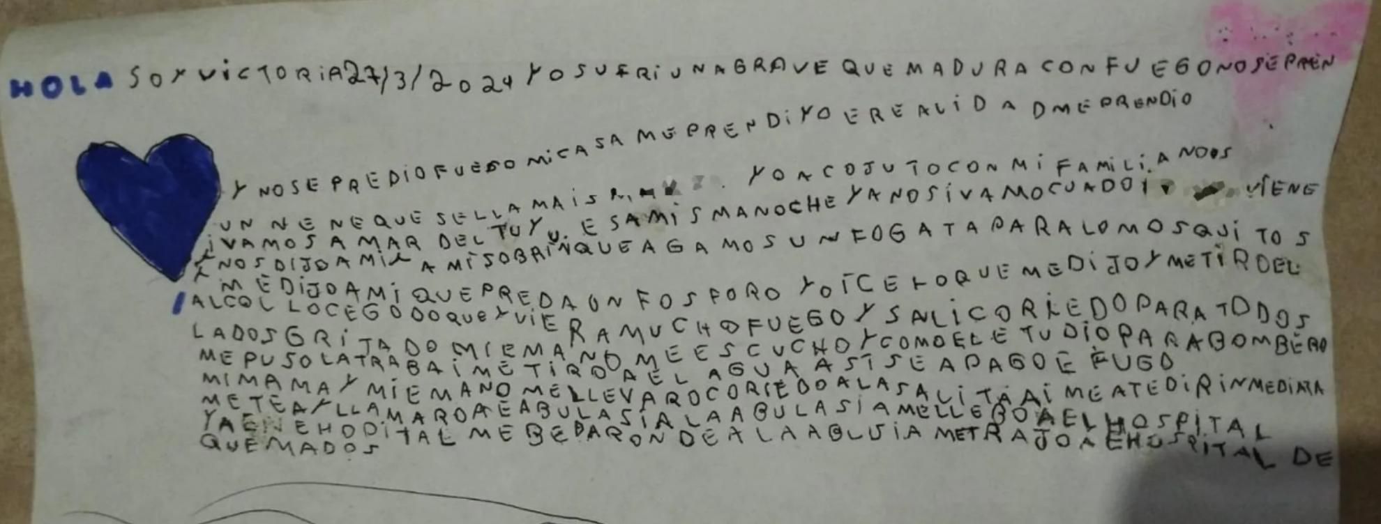 Además, la nena contó meses atrás en una carta: "Me dijo que hagamos una fogata para los mosquitos, me dijo que prenda un fósforo. Yo hice lo que me dijo, y me tiró el alcohol".