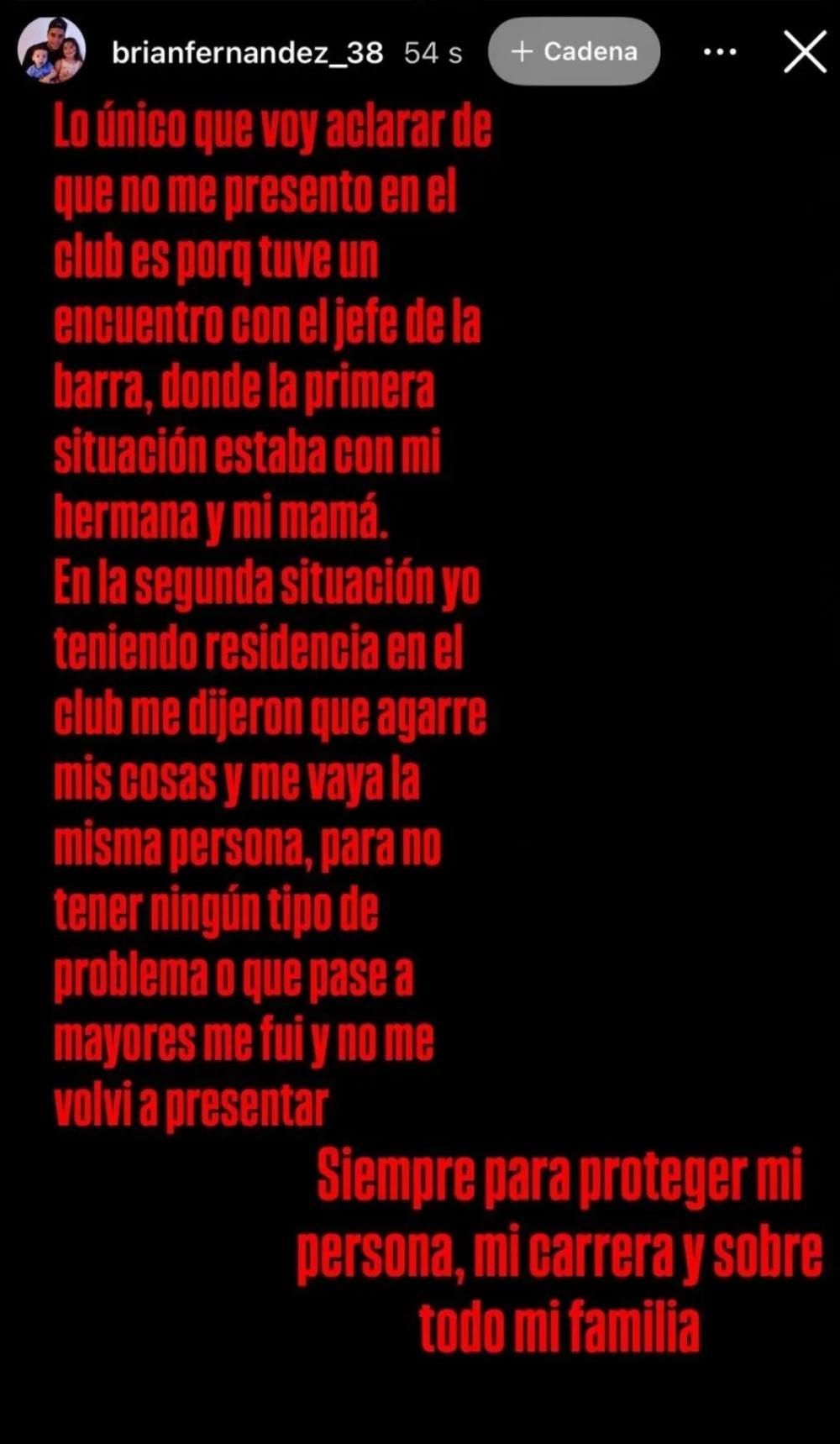 "Lo único que voy aclarar de que no me presentó en el club es porque tuve dos encuentros con el jefe de la barra", publicó en un posteo de Instagram, en el que detalló cómo fueron esos encuentros. "En el primero, estaba con mi hermana y mi mamá. Y en el segundo, teniendo residencia en el club, me dijo que agarre mis cosas y me vaya. Para no tener ningún tipo de problema o pase a mayores, me fui y no me volví a presentar. Siempre para proteger a mi persona, mi carrera y sobre todo a mi familia", comentó.