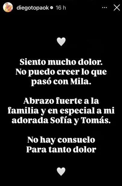 "Siento mucho dolor. No puedo creer lo que pasó con Mila. Abrazo fuerte a la familia y en especial a mi adorada Sofía y Tomás. No hay consuelo para tanto dolor", expresó el artista.