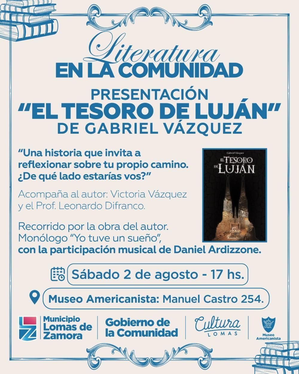 Este sábado 2 de agosto se llevará a cabo la presentación del libro "El tesoro de Luján", una obra del escritor Gabriel Vázquez. El encuentro, organizado por el ciclo Literatura en la Comunidad, será totalmente gratuito y contará, además, con un monólogo de la propia autoría de Vázquez.