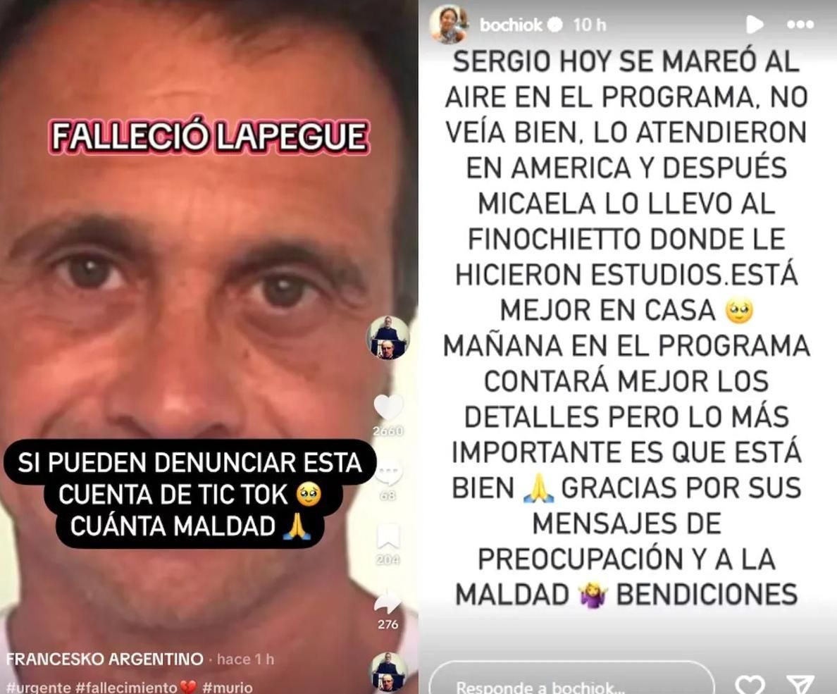 Mientras que este lunes por la noche, Bochi, la esposa del conductor, salió al cruce de algunos posteos que observó en redes donde hablaban de un cuadro complicado de Sergio y hasta incluso su supuesto fallecimiento.