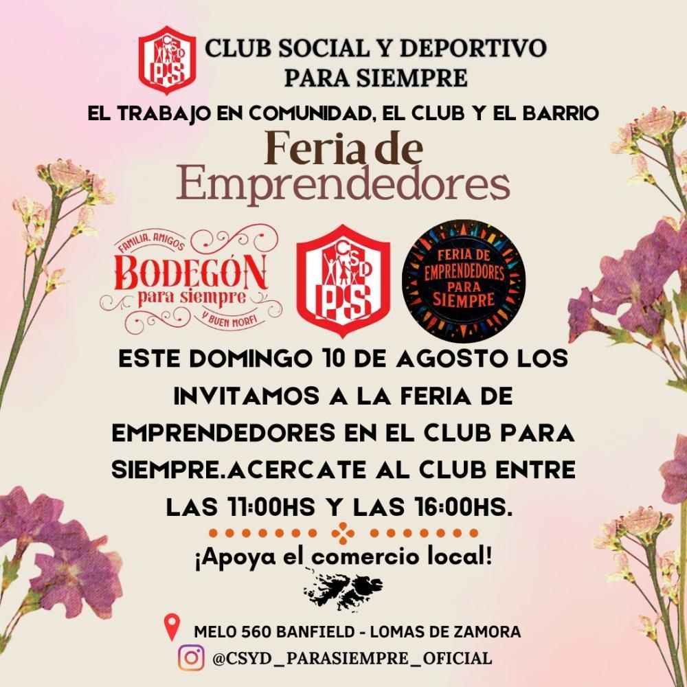El Club Social y Deportivo Para Siempre de Banfield realizará, el próximo domingo 10 de agosto, una feria de emprendedores con el objetivo de brindarles apoyo a los emprendedores para que obtengan ingresos económicos. La entrada es totalmente libre y gratuita.