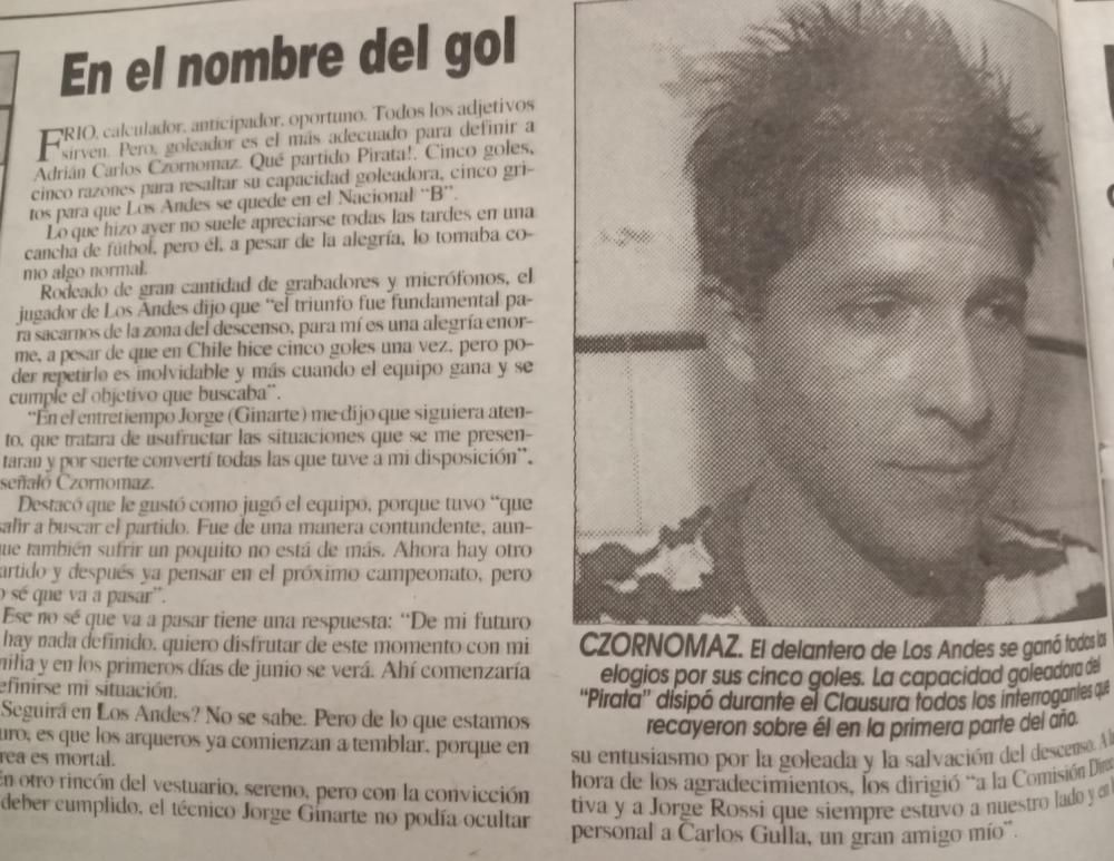 Los Andes visitará este domingo al Albo, y el "Pirata" fue el gran protagonista del triunfo por 6-2, en el Torneo Clausura 1996, en el estadio Gallardón.