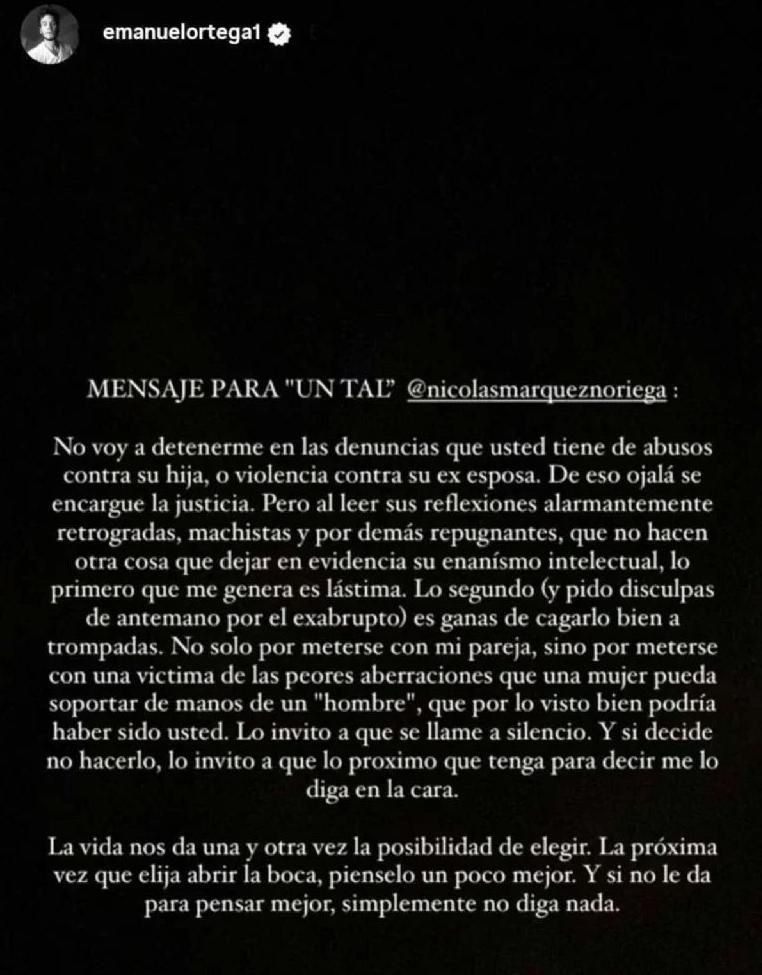 El polémico mensaje fue eliminado poco después pero estuvo el tiempo necesario para recibir todo tipo de críticas. Emanuel Ortega, pareja actual de Julieta, y le respondió con un fuerte mensaje el cual hizo referencia a la gravísima denuncia contra Márquez.