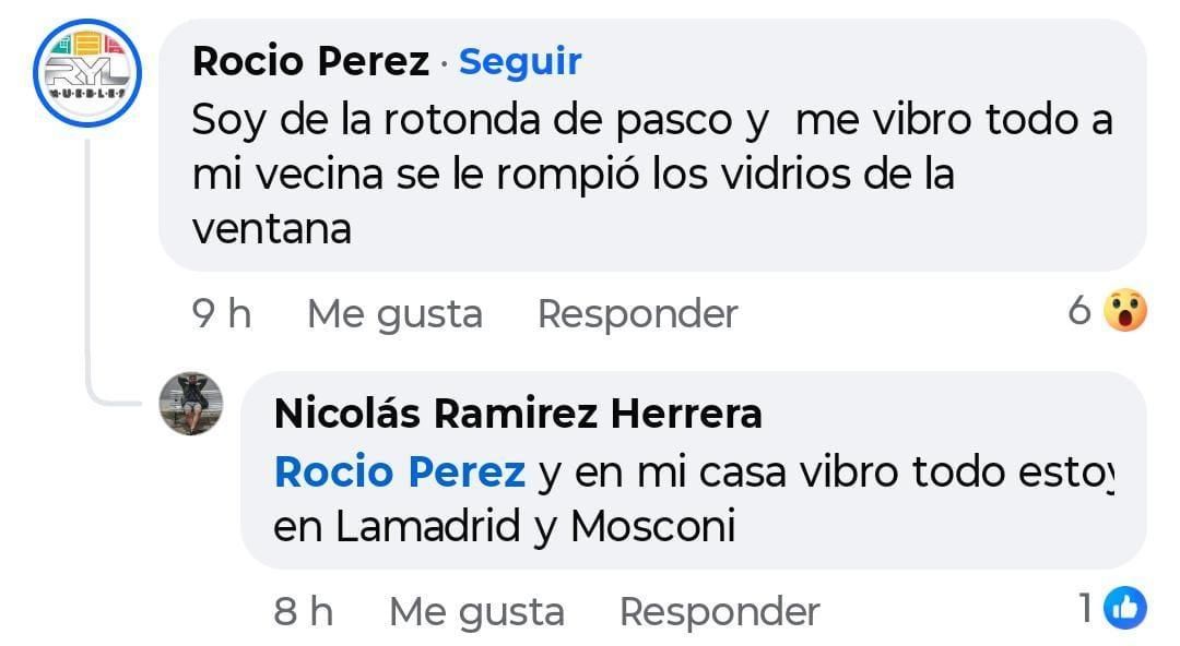 A través de diversos comentarios, los vecinos contaron de qué manera vivieron el momento del detonante y, en algunos casos, la explosión ocasionó daños materiales en las viviendas. "Estaba acostado, durmiendo, y la explosión me reventó el reboque", contó el usuario Dani Aguilar, mientras que Rocío Pérez, que vive a metros de la rotonda de Pasco, sintió una fuerte vibración y que incluso "a una vecina se le rompieron los vidrios de las ventanas".