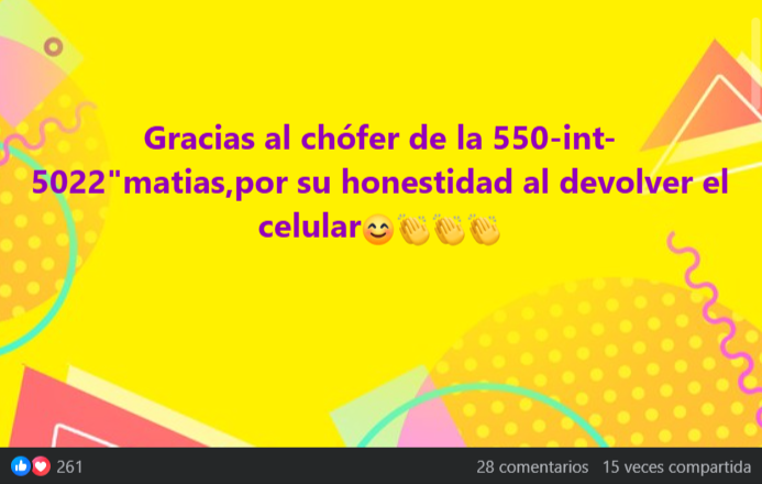 En las redes sociales, más precisamente en un grupo de Facebook integrado por vecinos lomenses, la usuaria Emilia Carrizo (tía del niño) escribió un posteo a modo de agradecimiento: "Gracias al chofer de la 550 por su honestidad al devolver el celular". La publicación alcanzó cientos de "Me Gusta" y decenas de comentarios.