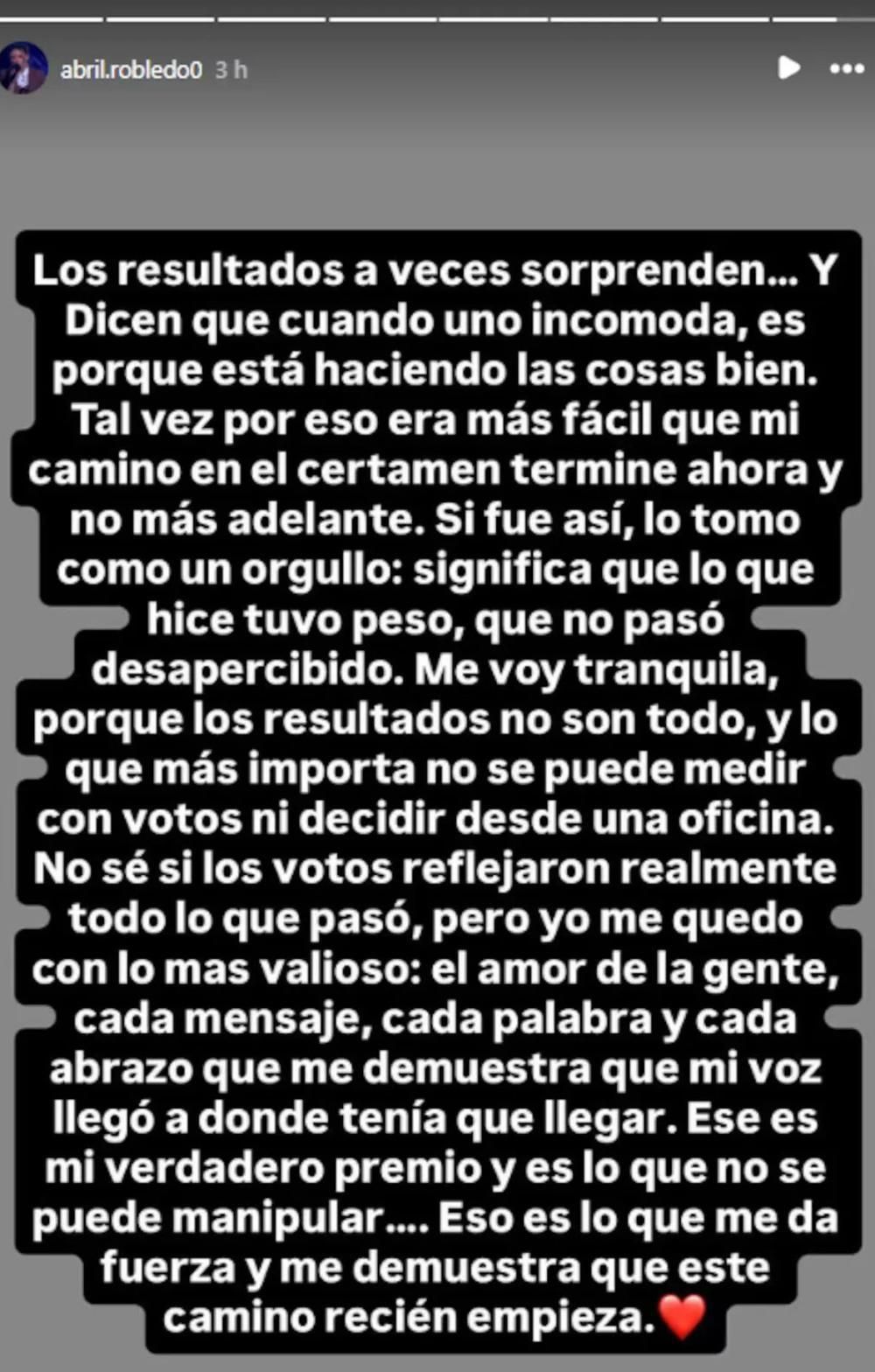 "No sé si los votos reflejaron realmente todo lo que pasó, pero yo me quedo con lo más valioso: el amor de la gente, cada mensaje, cada palabra y cada abrazo que me demuestra que mi voz llegó a donde tenía que llegar", afirmó.