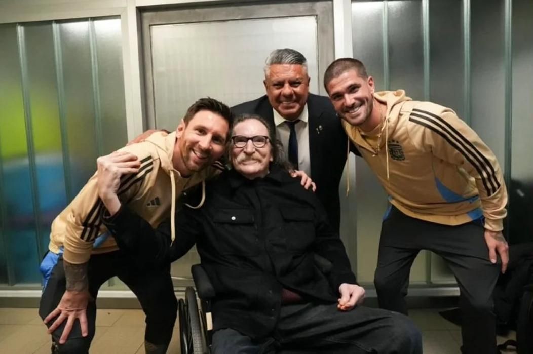 El músico fue a ver el partido de Argentina frente a Venezuela y luego se sacó una foto con el rosarino, junto con Rodrigo de Paul y Chiqui Tapia.