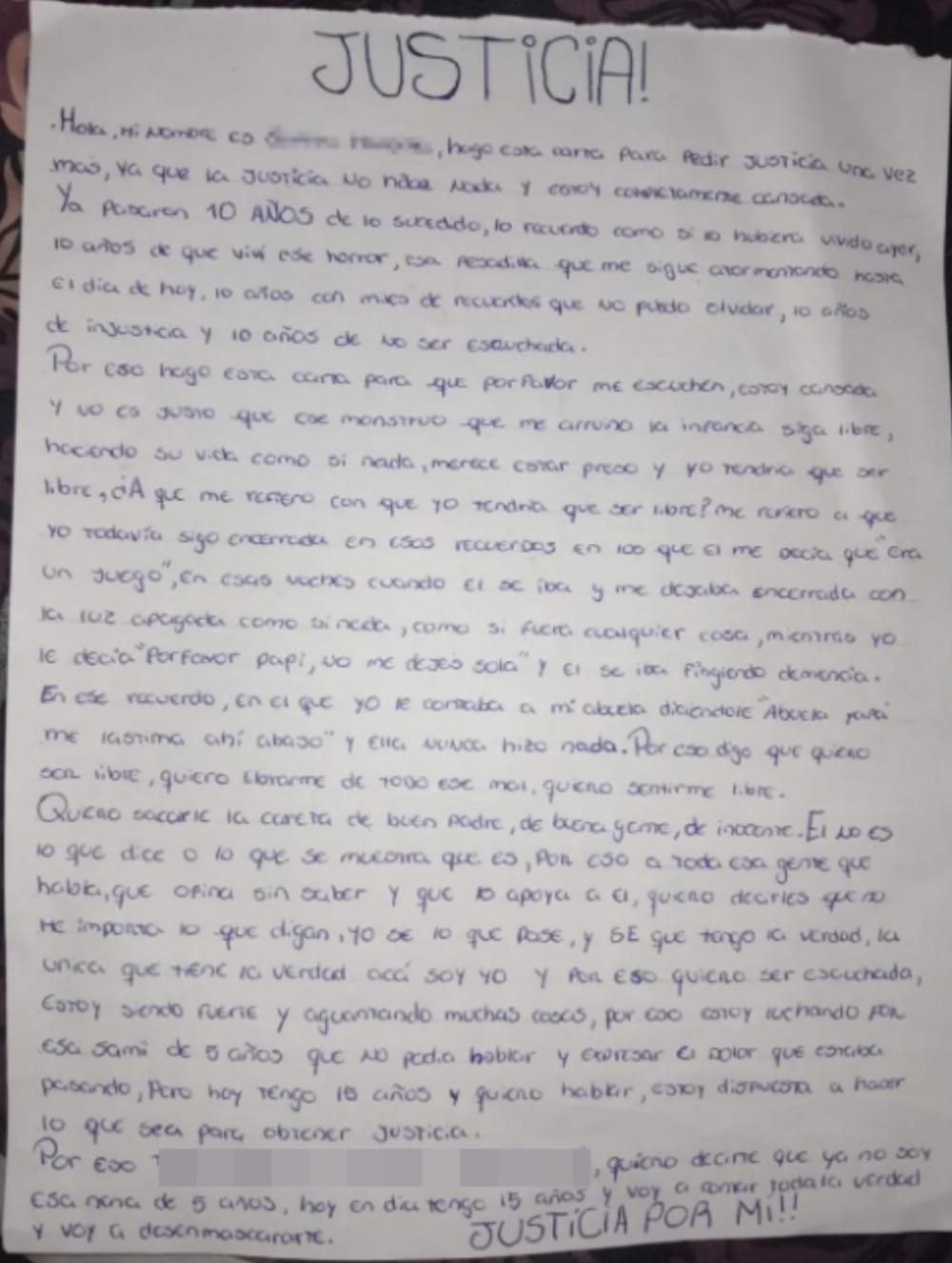 Por medio de su defensa, había requerido el sobreseimiento, pero este fue denegado por la fiscalía, debido a que consideró determinante los resultados de las pericias realizados a la menor. Por su parte, la víctima escribió una carta de puño y letra para pedir justicia.