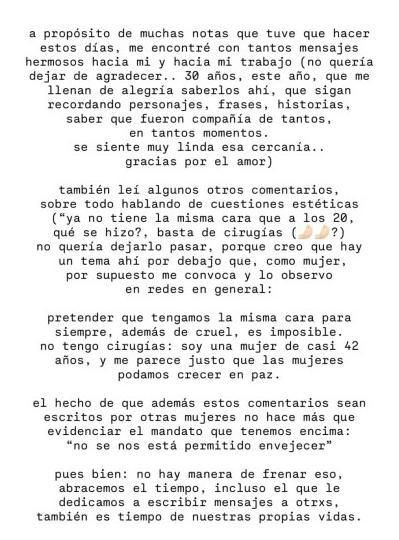 Para luego referirse a las acusaciones: "Y leí otros comentarios, sobre todo aquellos que hablaban de cuestiones estéticas ('ya no tiene la misma cara que a los 20?, '¿qué se hizo?', 'basta de cirugías')".