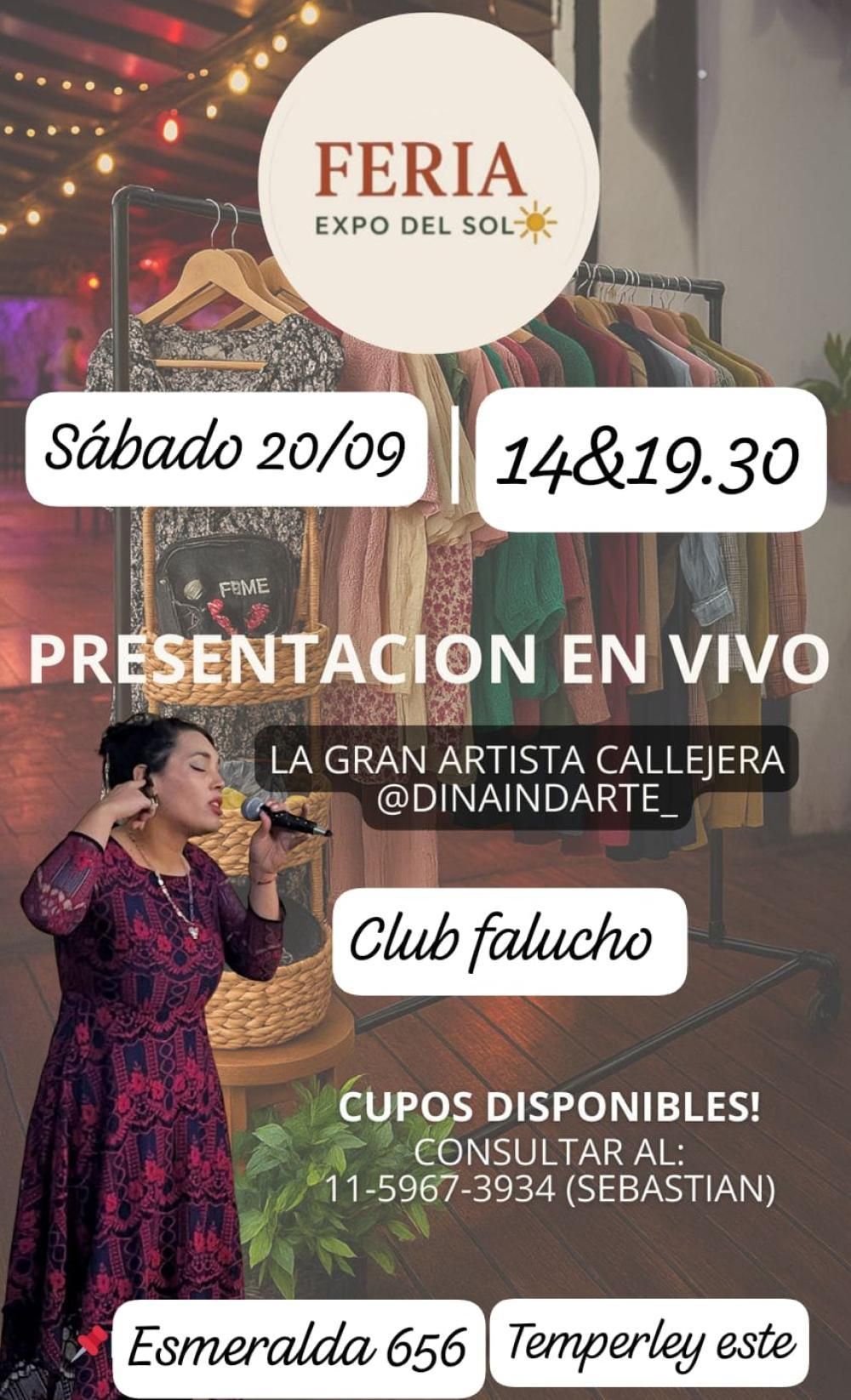 El festejo por la llagada de la Primavera se viene con muchas sorpresas en la edición de este sábado que organiza la Feria Expo del Sol en el Club Falucho de Temperley donde además de una variedad de puestos estará brindando un show exclusivo la cantante callejera, Dina Indarte.