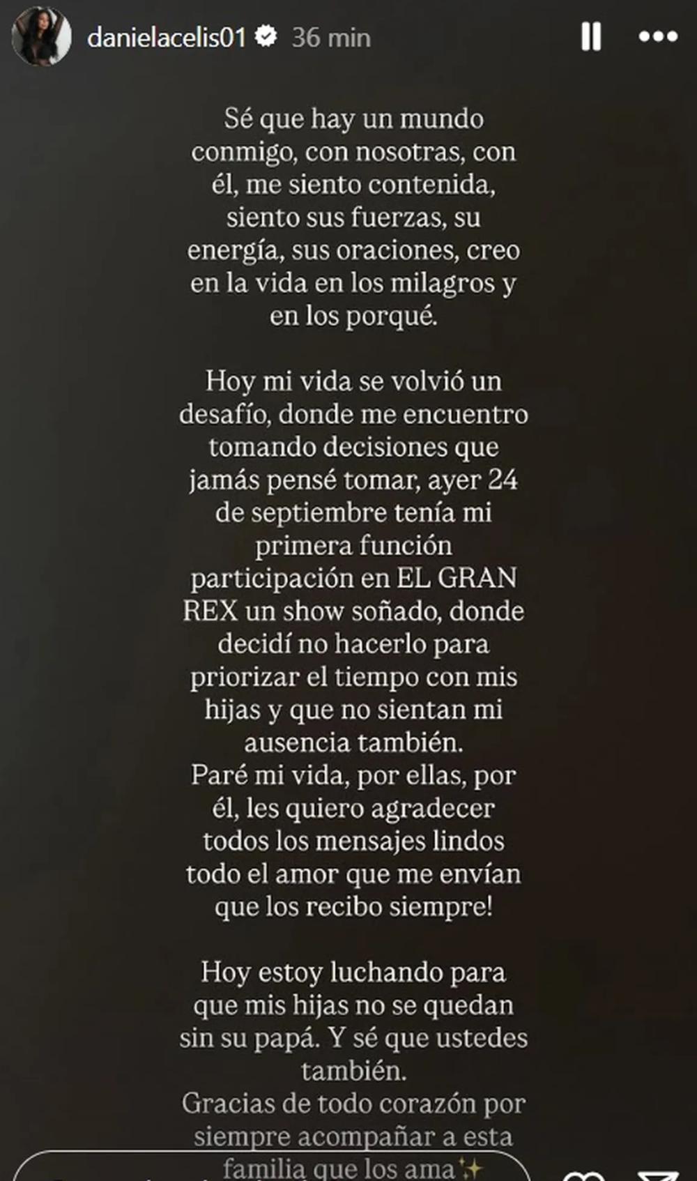 "Hoy mi vida se volvió un desafío, donde me encuentro tomando decisiones que jamás pensé tomar, ayer 24 de septiembre tenía mi primera función participación en el Gran Rex, un show soñado, donde decidí no hacerlo para priorizar el tiempo con mis hijas y que no sientan mi ausencia también", escribió la ex GH.