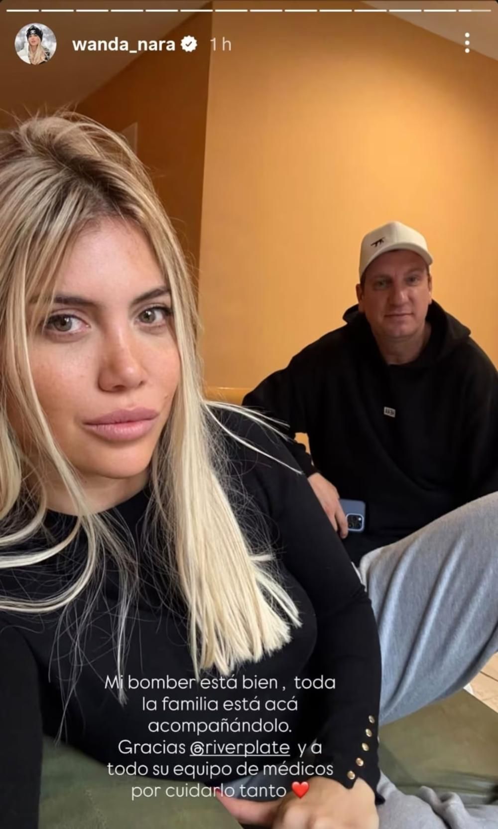 "Mi bomber está bien, toda la familia está acá acompañándolo. Gracias River Plate y a todo su equipo de médicos por cuidarlo tanto", escribió Wanda Nara.