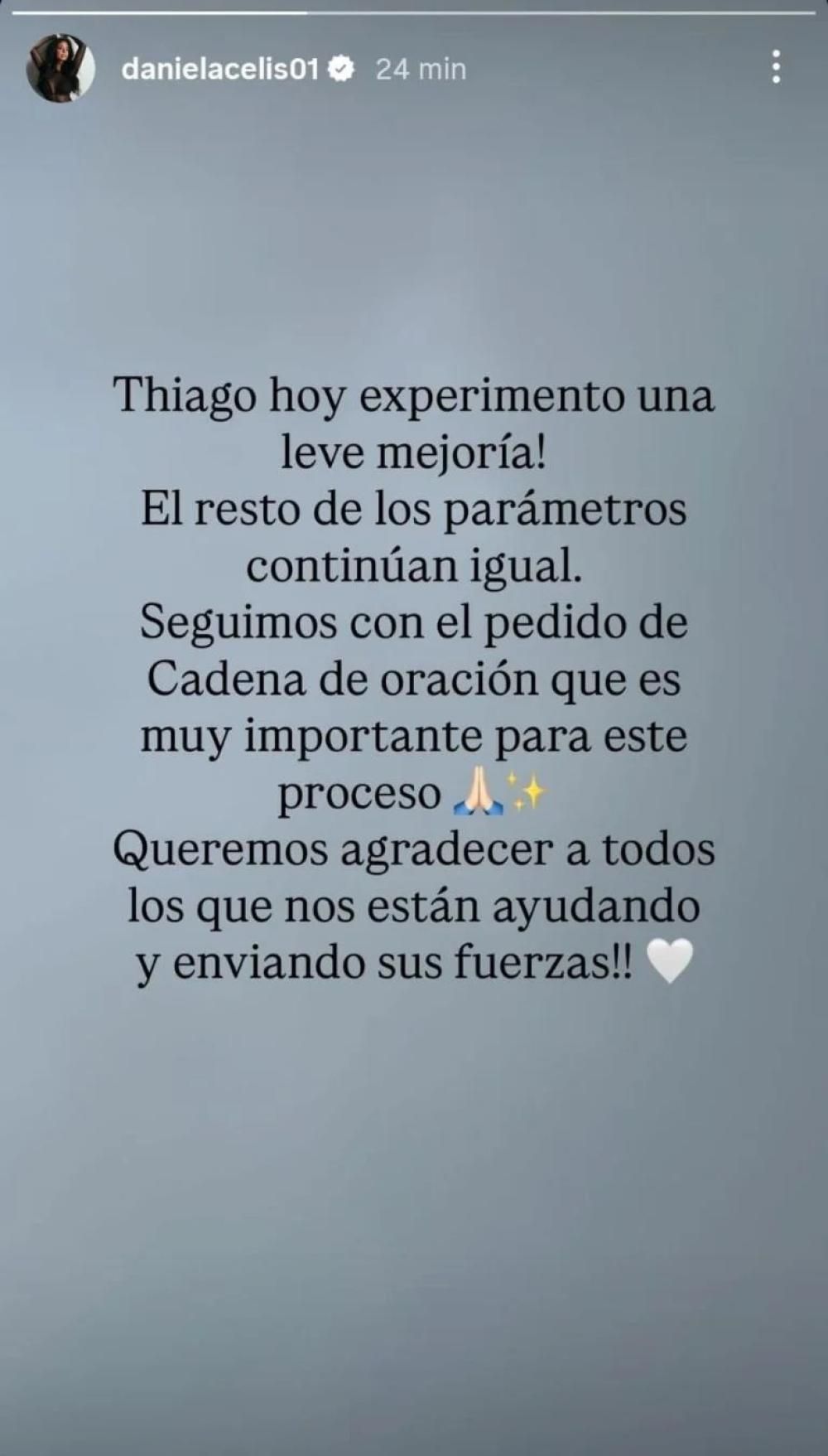 Sin embargo, en las últimas horas Daniela Celis dejó un mensaje esperanzador en su cuenta de Instagram: contó que Thiago presentó una "leve mejoría".