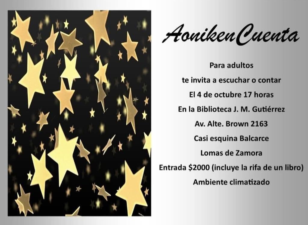 El grupo lomense Aoniken Cuenta realizará, el próximo sábado 4 de octubre, un nuevo encuentro de narración oral, donde los vecinos de Lomas tendrán la posibilidad de contar cuentos o asistir como oyentes. La actividad se hará en la Biblioteca Juan María Gutiérrez, con entradas a precios populares.