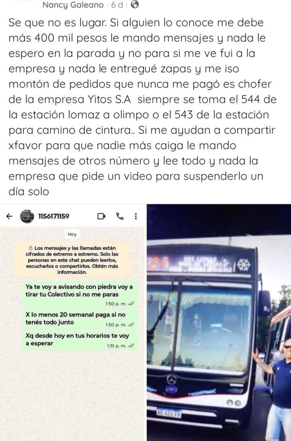 En una de las capturas de pantalla que publicó la propia Nancy en grupos de Facebook de Lomas, se leía la advertencia que le había dado al colectivero. "Ya te voy avisando, con piedra voy a tirar tu colectivo si no me parás. Por lo menos 20 semanal pagá si no tenés todo junto, porque desde hoy en tus horarios te voy a esperar", decía Nancy en el chat de WhatsApp. El conflicto quedó en manos de los abogados de Nancy, mientras que la empresa Yitos repudió la agresión.