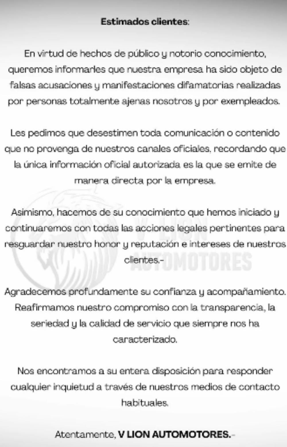 "En virtud de los hechos de público y notorio conocimiento, queremos informales que nuestra empresa ha sido objeto de falsas acusaciones y manifestaciones difamatorias realizadas por personas totalmente ajenas a nosotros y por empleados", se lee en la publicación compartida días atrás en la cuenta de Instagram automotoresvlion.