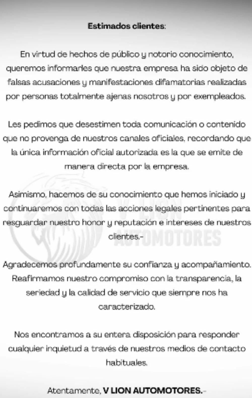 "En virtud de los hechos de público y notorio conocimiento, queremos informales que nuestra empresa ha sido objeto de falsas acusaciones y manifestaciones difamatorias realizadas por personas totalmente ajenas a nosotros y por empleados", se lee en la publicación compartida días atrás en la cuenta de Instagram automotoresvlion.
