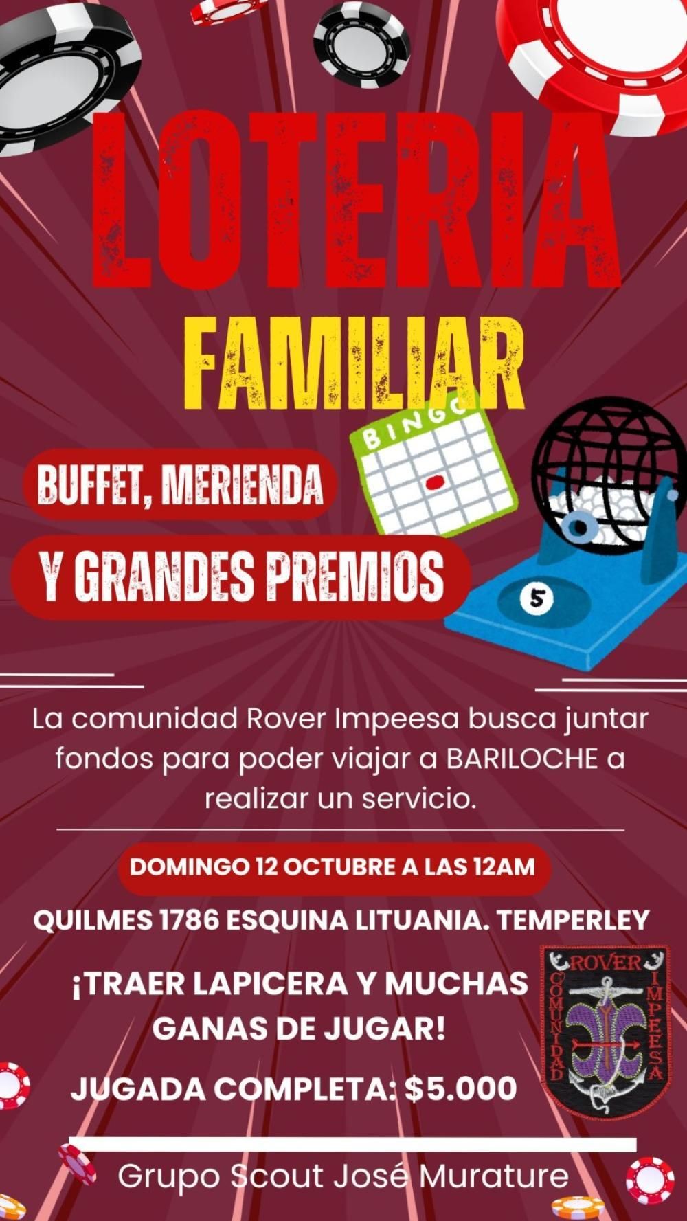 La comunidad Rover Impeesa, perteneciente al Grupo Scout José Murature de Temperley, realizará una lotería familiar este domingo con el propósito de recaudar fondos para viajar a un campamento que se hará en Bariloche en enero de 2026. Aún quedan disponibles cartones.