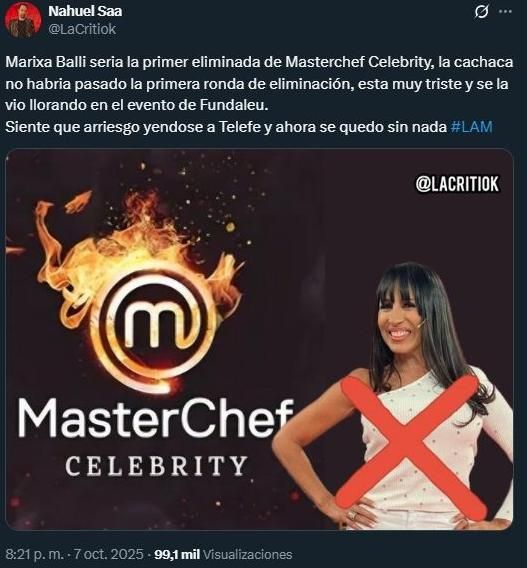 Mientras se espera por el debut, se habría filtrado quién sería la primera eliminada del reality culinario. Según reveló Nahuel Saa, conocido como "La Criti", Marixa Balli sería la primera participante en quedar afuera.