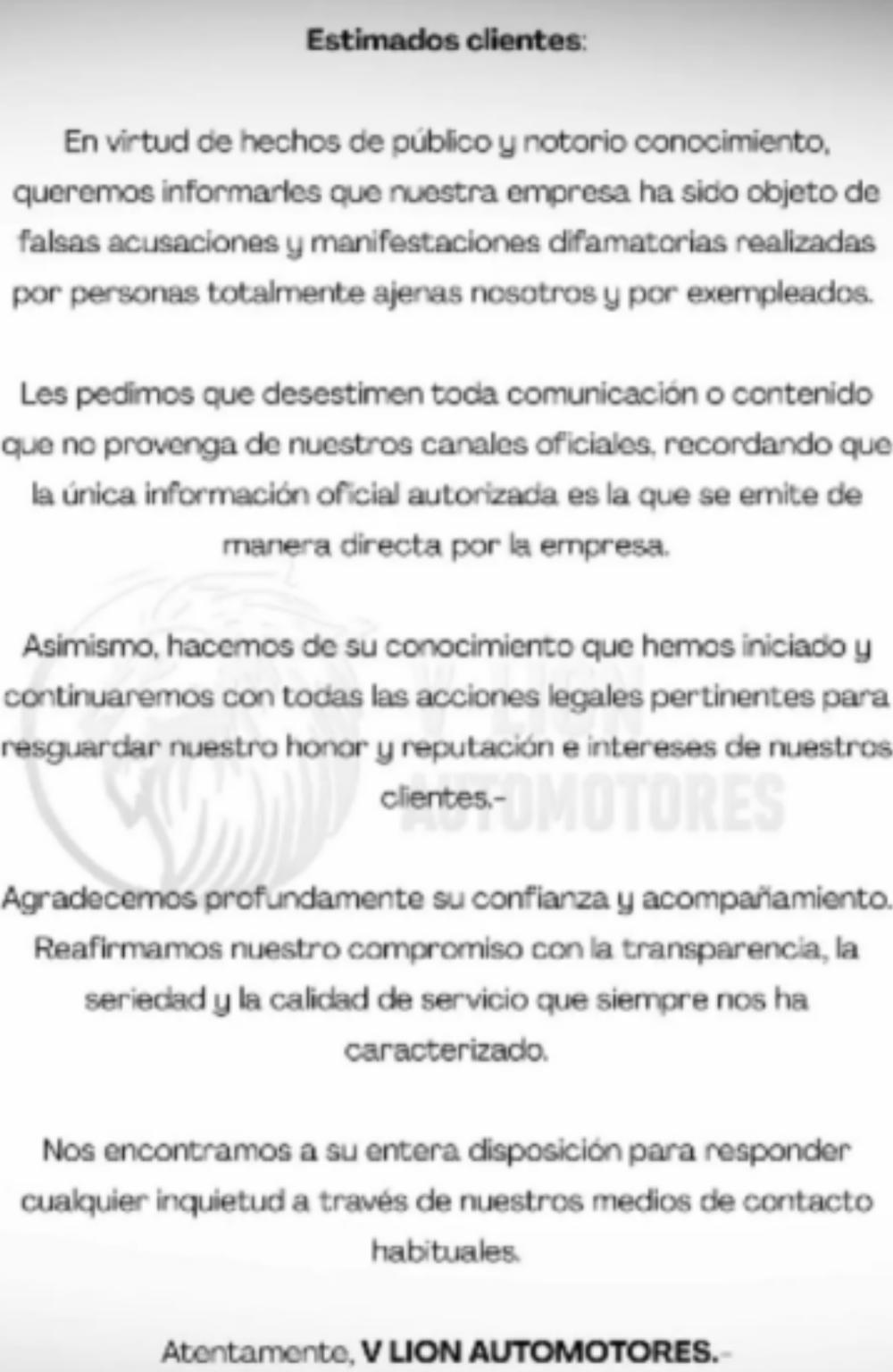 "En virtud de los hechos de público y notorio conocimiento, queremos informales que nuestra empresa ha sido objeto de falsas acusaciones y manifestaciones difamatorias realizadas por personas totalmente ajenas a nosotros y por empleados", se leía en la publicación compartida en la cuenta de Instagram automotoresvlion, y que más tarde fue borrada.