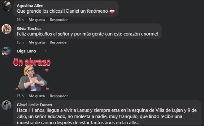"Estos son gestos que valen la pena. Felicitaciones a todo el equipo", escribió la vecina Mirta Núñez, mientras que Gissel Leslie Franco se sumó y agregó: "Hace 11 años llegué a vivir a Lanús y David siempre estuvo en la esquina de 9 de Julio y Villa de Luján. Un señor educado que no molesta a nadie y es muy tranquilo. Qué lindo recibir una muestra de cariño después de estar tantos años en la calle".