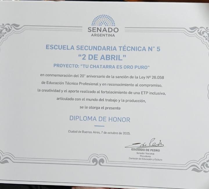 Los alumnos y docentes de la Escuela de Educación Técnica Nº5 "2 de Abril" de Temperley recibieron ayer un Diploma de Honor por parte del Senado de la Nación Argentina por su proyecto "Tu chatarra es oro puro", el cual consiste en extraer el oro de los componentes electrónicos en desuso y, además, convertir el resto de la chatarra en ladrillos para la construcción.