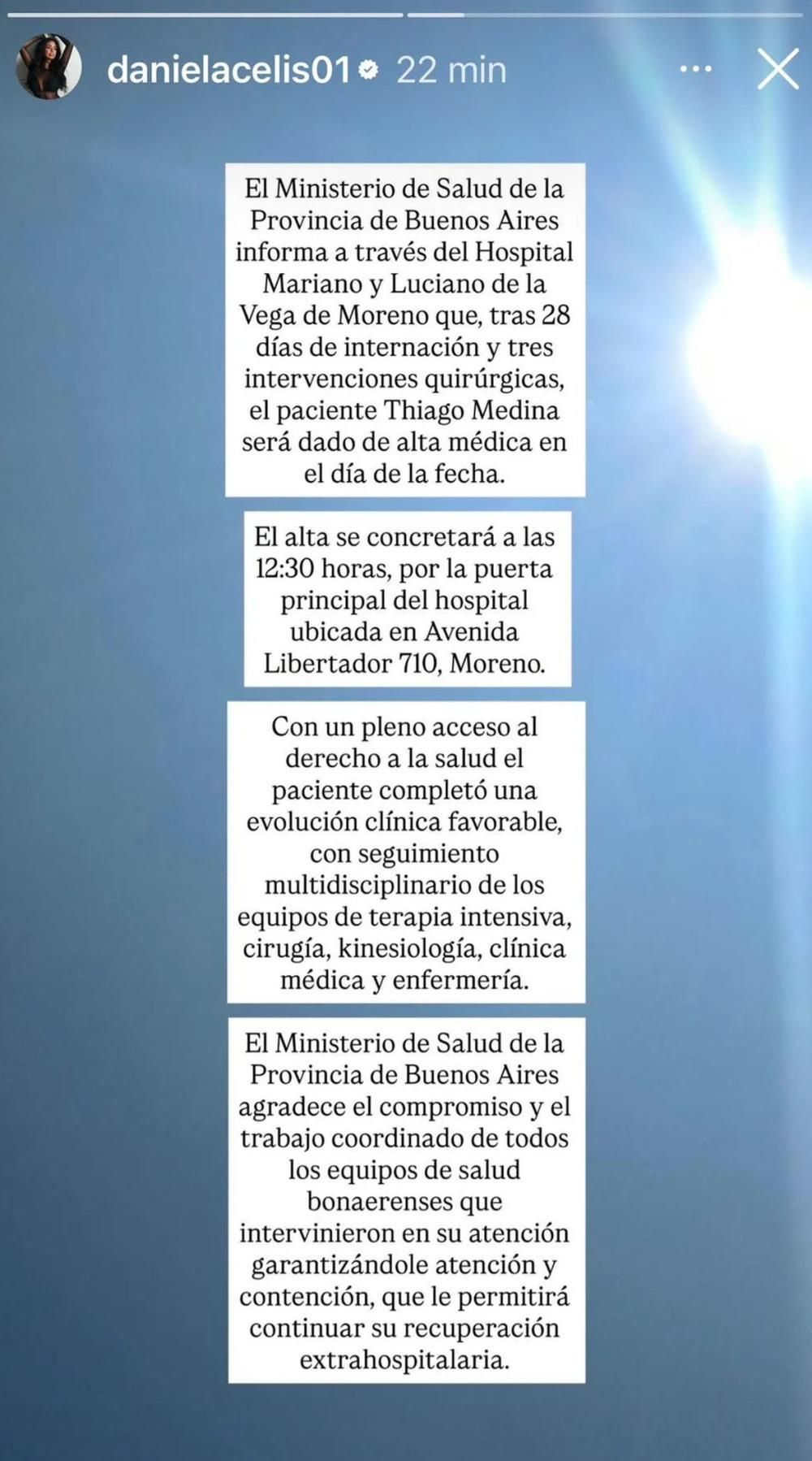 En la segunda publicación, Pestañela compartió el parte médico anunciando el alta médica de Thiago para este mediodía y la forma en que continuará su recuperación física.
