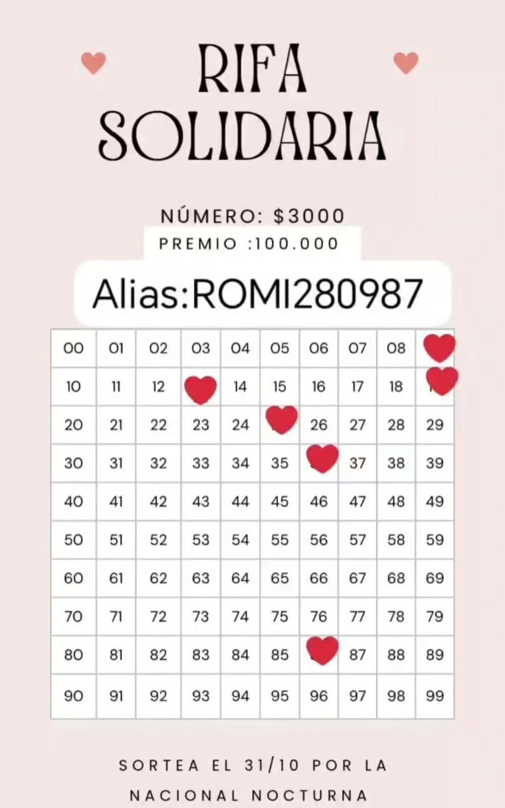 En una charla con este medio, Romina indicó que la rifa, que contiene 100 números y pone en juego $100.000, se sorteará el próximo viernes 31 de octubre por Lotería Nacional Nocturna, método usado para garantizar una transparencia a la hora de conocer al ganador.