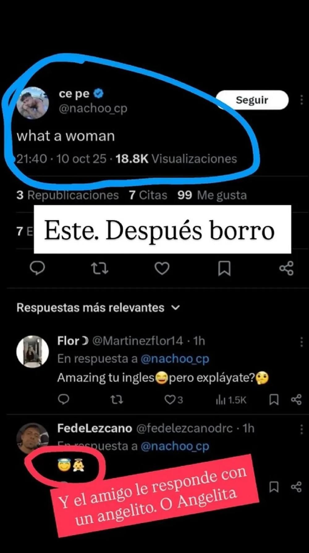 Además, Fede Lezcano, amigo de Nacho y compañero de Fuera de Joda, lo escrachó porque le comentó con el emoji de un angelito o angelita. Y para evitar que se genere ruido con ese comentario, Nacho borró el posteo, pero ya era tarde.