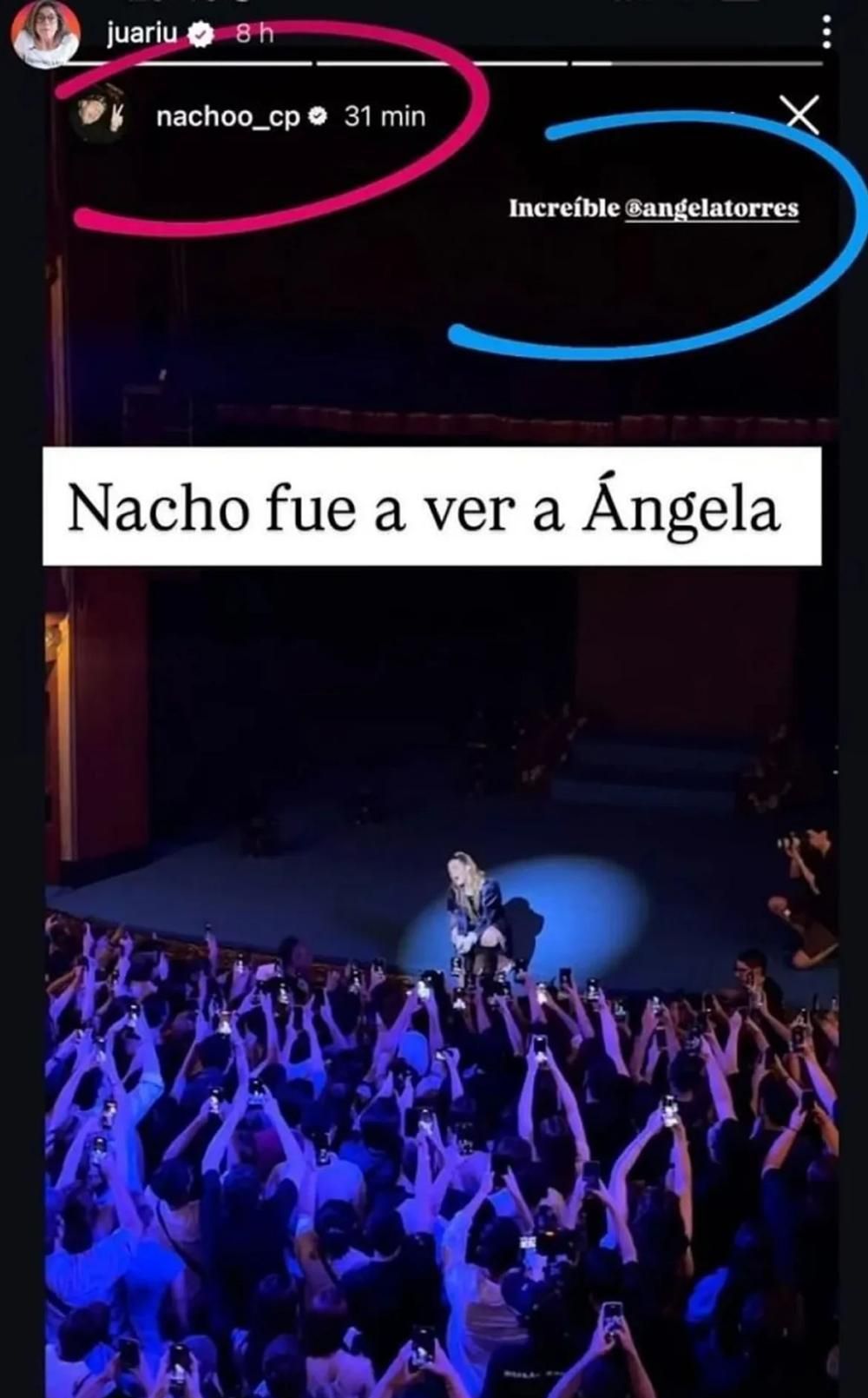 "Nacho fue a ver a Ángela", lanzó Juariu en sus historias de Instagram mostrando la imagen de él en el recital de la artista en el Teatro Margarita Xirgu .