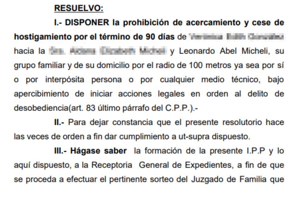 Según consta en el documento judicial, al que accedió La Unión, por los próximos 90 días, la acusada no deberá acercarse hacía Leonardo Abel Micheli, y su grupo familiar y de su domicilio "por el radio de 100 metros, ya sea por sí o por interpósita persona o por cualquier medio técnico, bajo apercibimiento de iniciar acciones legales en orden al delito de desobediencia".