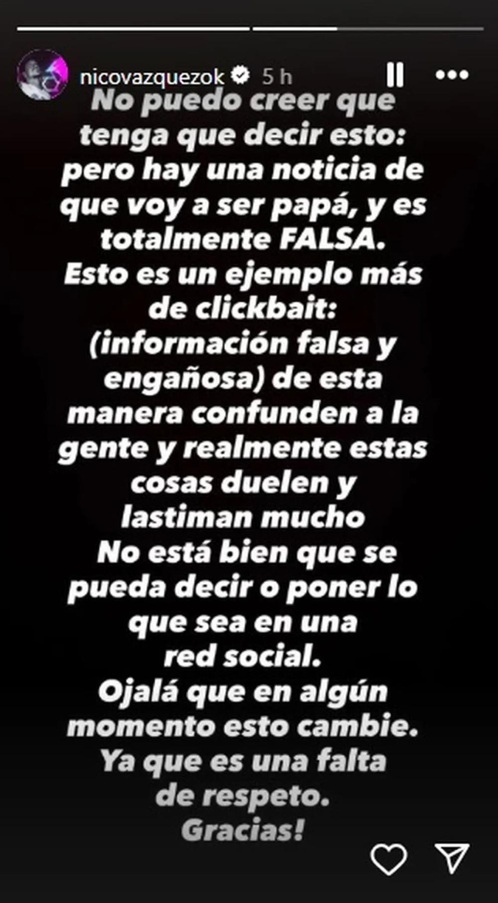 "No puedo creer que tenga que decir esto: pero hay una noticia de que voy a ser papá, y es totalmente FALSA. Esto es un ejemplo más de clickbait: (información falsa y engañosa) de esta manera confunden a la gente y realmente estas cosas duelen y lastiman mucho", comenzó.