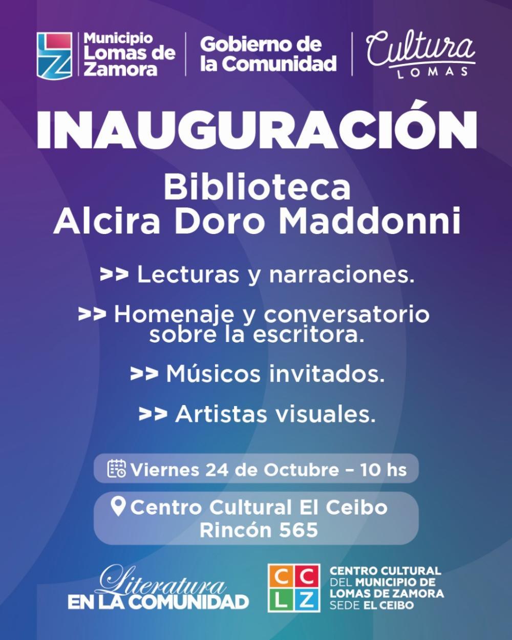 Una nueva biblioteca se inaugurará este viernes 24 de octubre en Lomas: el Centro Cultural El Ceibo contará con una hemeroteca que llevará el nombre de "Alcira Doro Maddonni", una de las pioneras de la Sociedad Argentina de Escritores (SADE) Filial Lomas. El encuentro es abierto y gratuito para la comunidad.