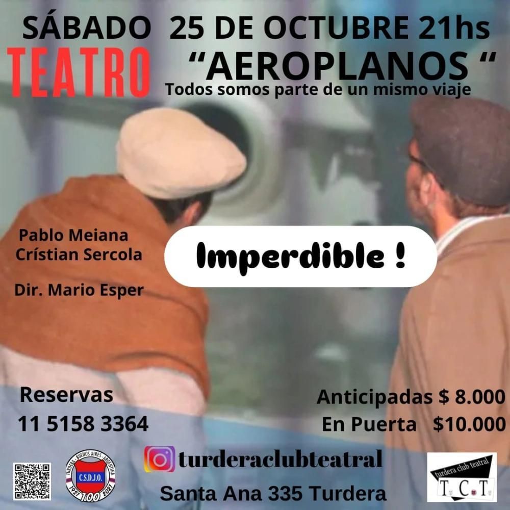 La obra de teatro comenzará a partir de las 21 y se podrá ver en la sede de la institución, la cual se encuentra ubicada en Santa Ana 335 (Turdera). "Aeroplanos", de Carlos Gorostiza, cuenta con las interpretaciones de Pablo Meiana y Cristian Sercola, bajo la dirección de Mario Esper.