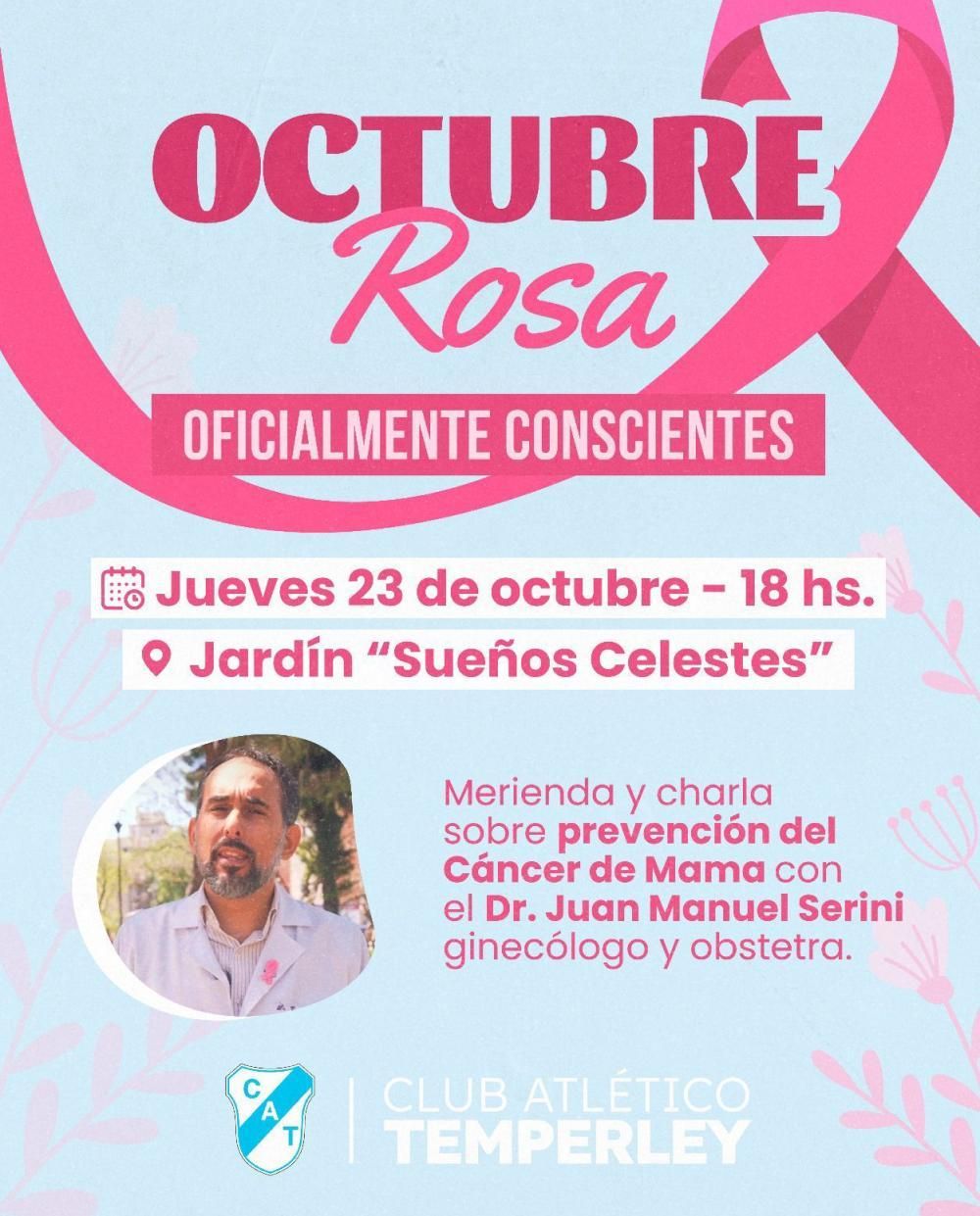 Con el objetivo central de concientizar respecto a la prevención del cáncer de mama de la mano de un especialista, el Club Atlético Temperley organiza el encuentro gratuito "Merienda Rosa" que tendrá lugar este jueves a las 18 en el salón del Jardín Sueños Celestes.