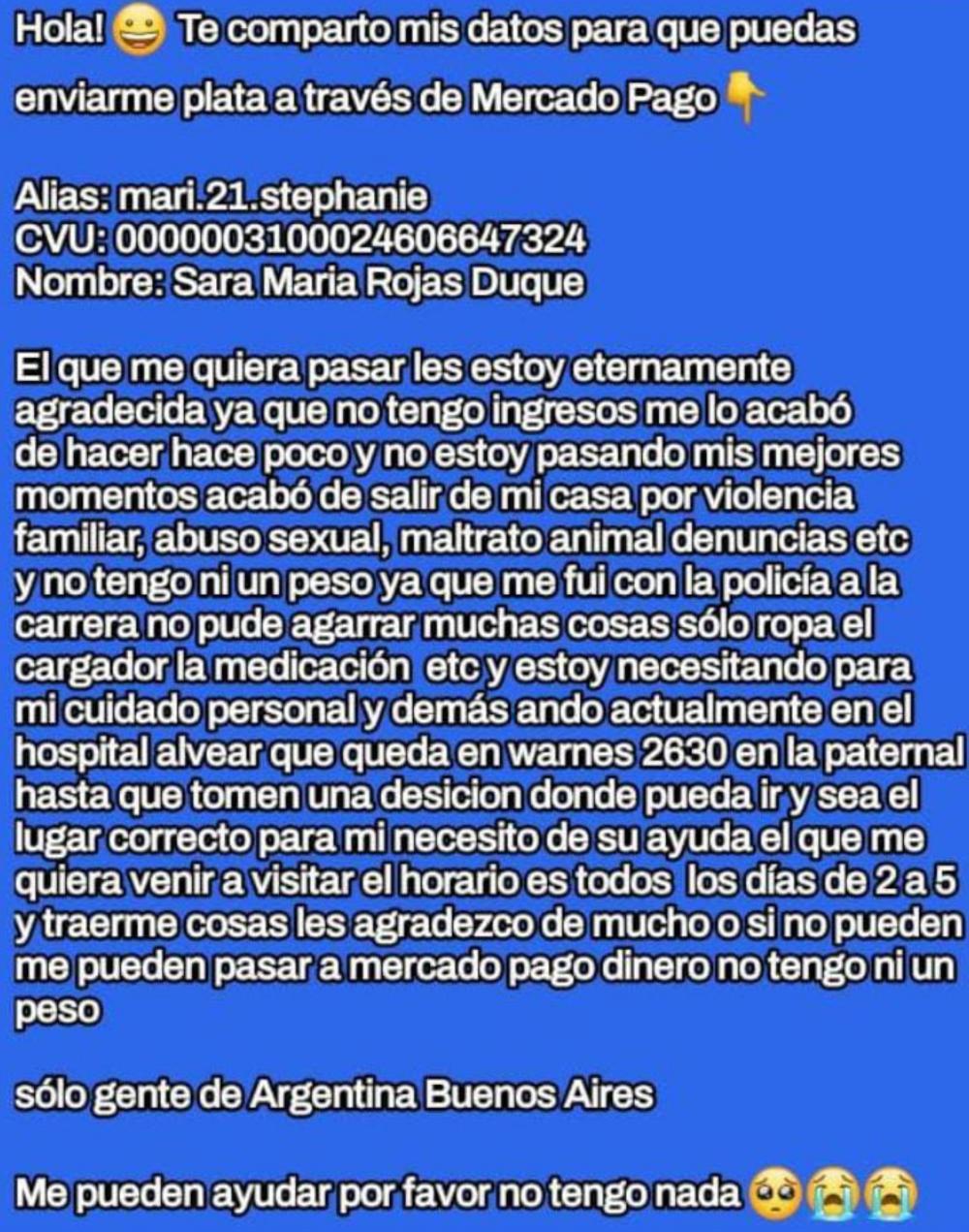 "Ella está internada y pide ayuda económica, y por eso pedimos a las autoridades que la protejan, que no la dejen sola, y que sigan investigando a su familia", explicó Leonela Barros a este medio. "Queremos que siga su tratamiento, y que no la dejen volver con sus abusadores, por el bien de ella", agregó la joven activista.