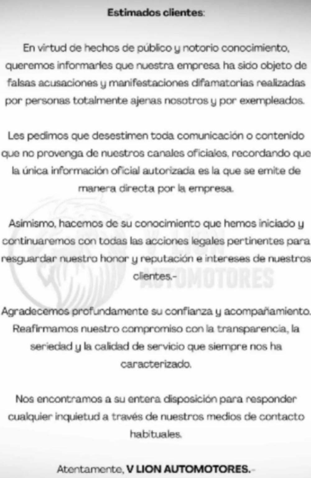 "En virtud de los hechos de público y notorio conocimiento, queremos informales que nuestra empresa ha sido objeto de falsas acusaciones y manifestaciones difamatorias realizadas por personas totalmente ajenas a nosotros y por empleados", se lee en la publicación compartida días atrás en la cuenta de Instagram automotoresvlion.