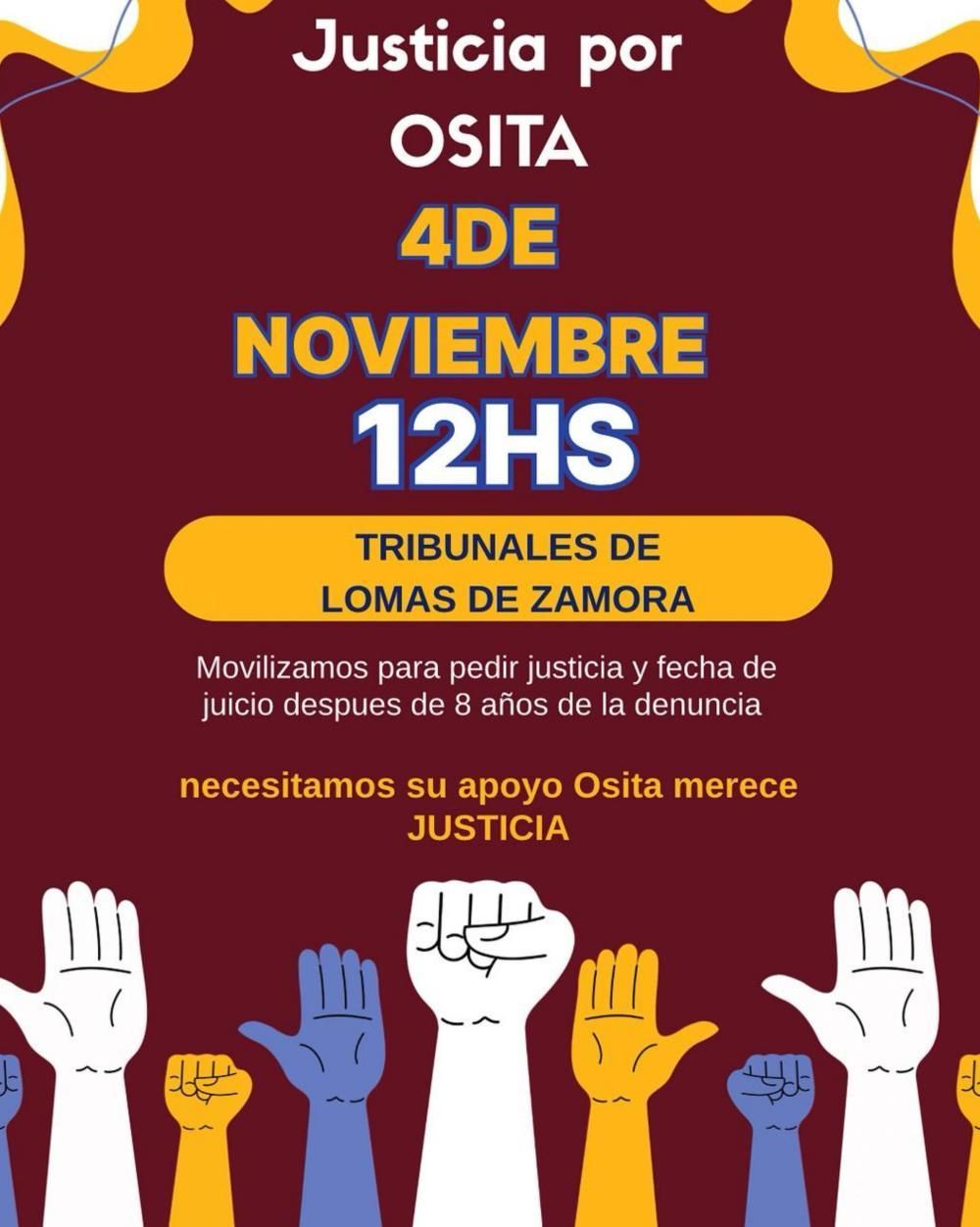 "Nesitamos su apoyo, Osita necesita justicia", publicaron los organizadores de la marcha, similar a la que llevaron a cabo la semana pasada en la puerta del Departamento Judicial de Lomas, donde tramita la causa.