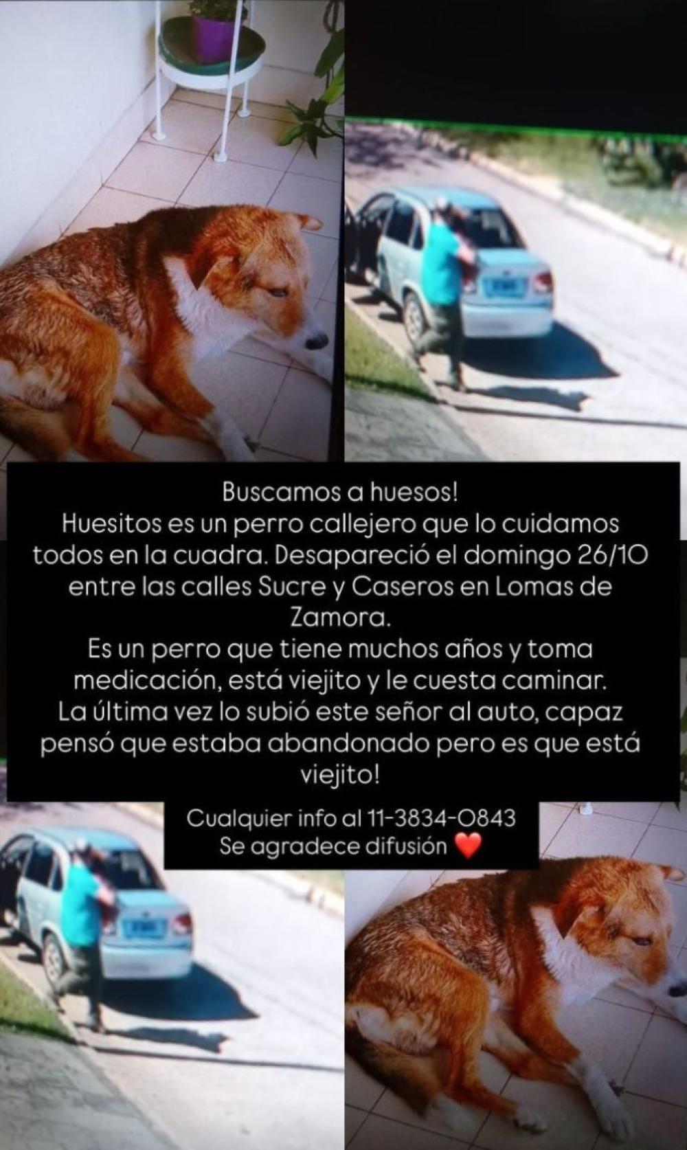 Huesos es un perro de unos 11 años que toda su vida estuvo en la calle, pero el barrio lo adoptó como propio. El domingo pasado desapareció repentinamente de las calles que siempre recorría, Caseros y Sucre, en Parque Barón. Los vecinos, muy preocupados, comenzaron a investigar y encontraron un video que muestra el momento que un hombre lo sube a su auto y se lo lleva.