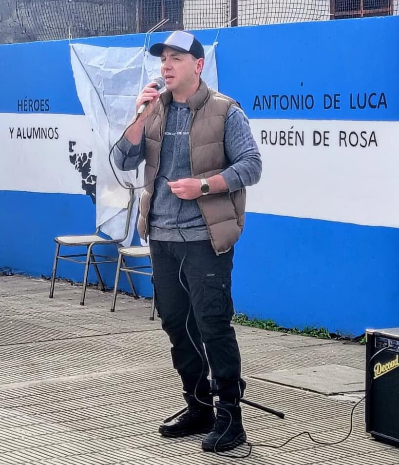 Se trata de Antonio De Luca, actual presidente de la Comisión de Enlace de Veteranos de Guerra de Lomas de Zamora, quien acompañó el acto junto a integrantes de la comisión compartiendo su testimonio y su compromiso permanente con la causa Malvinas.