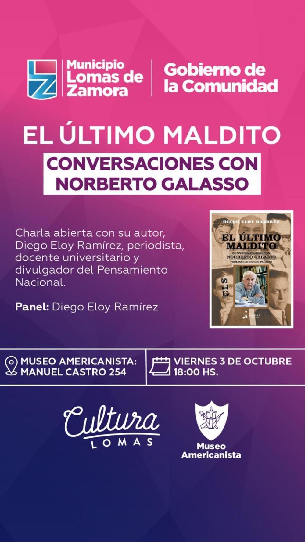 El Museo Americanista será sede, una vez más, de la presentación de un libro con identidad lomense. "El último maldito: conversaciones con Norberto Galasso" es una obra de la autoría de Diego Eloy Ramírez, quien estará presente en Lomas el próximo viernes 3 de octubre para dialogar con los vecinos acerca de su creación literaria.