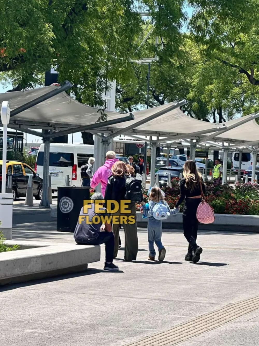 "Acaban de llegar la China Suárez junto a Mauro Icardi a Aeroparque en un gran despliegue que hizo migraciones para poder retirarlos. Venían junto a Amancio y Magnolia desde Estambul. Ella llegó con el bolsito rosa de la discordia", escribió Fede Flowers, acompañando la publicación con fotografías del momento.