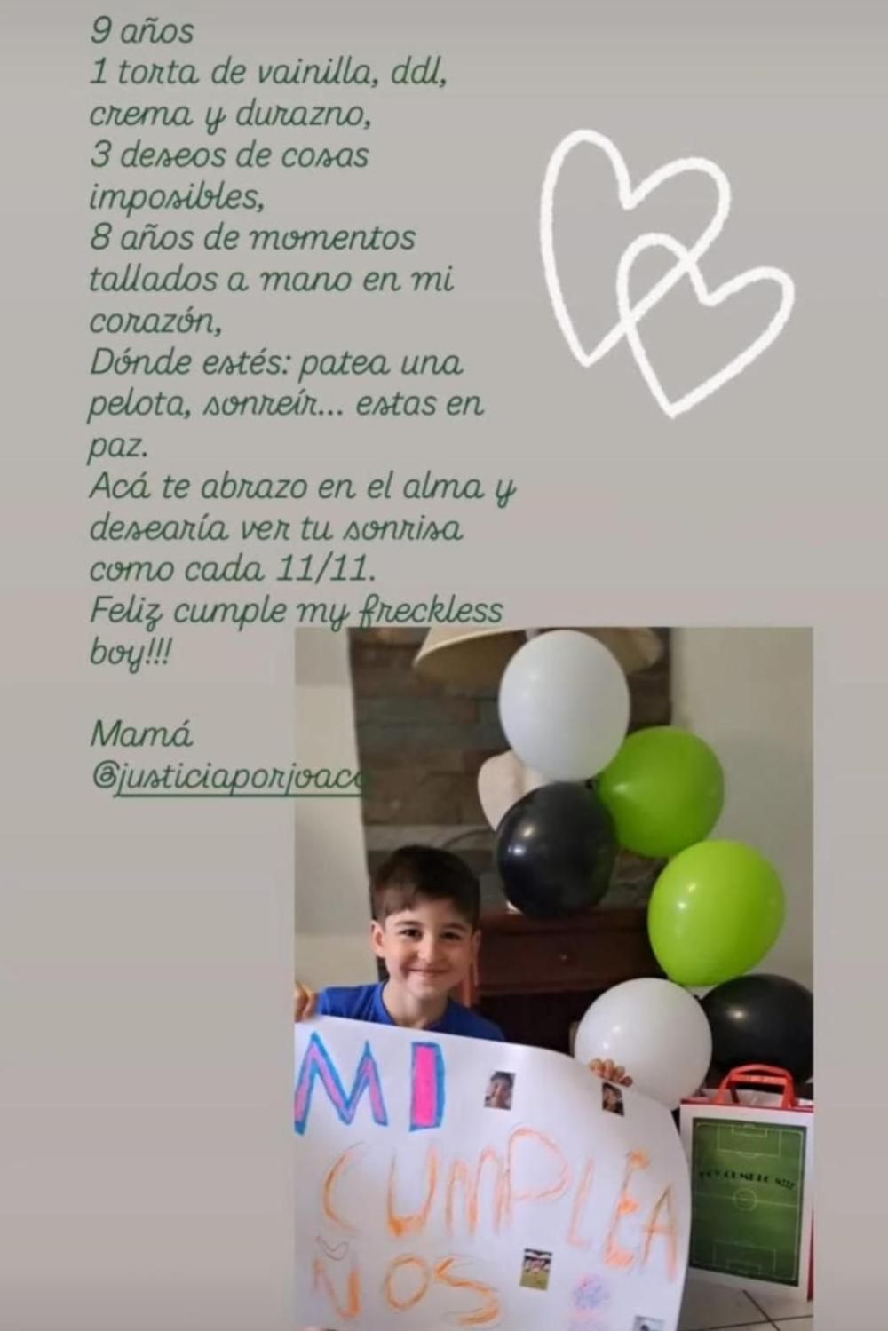 Los recuerdos se cruzan con el lógico reproche hacia su exmarido, responsable de que hoy el nene no esté con su mamá para festejar. "Para el próximo finde había reservado cancha de fútbol que habíamos ido a ver junto a su no-padre. ¿Sabés el dolor mayor? La traición a Joaqui", lamentó, y lanzó su repudio hacia "el innombrable que hoy no dejó que Joa cumpliera sus 9 años con lo mucho que amaba y disfrutaba compartir con sus amigos este día".